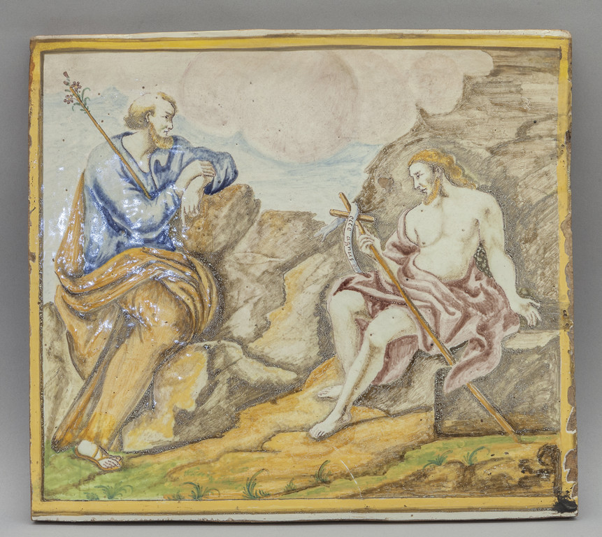 Placca in ceramica di Castelli raffigurante San Giuseppe con San Giovanni sec.XVIII