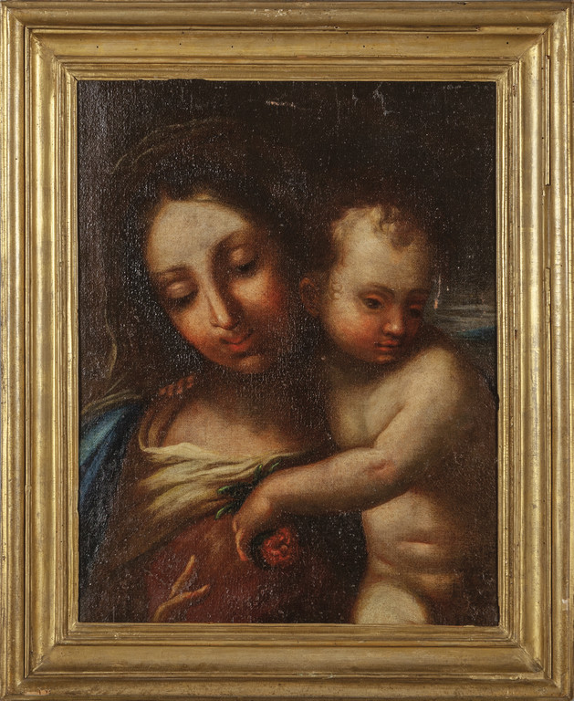 Scuola emiliana sec.XVII 'Madonna con Bambino' olio cornice coeva in legno intagliato e dorato