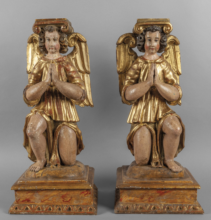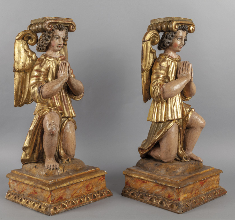 Coppia di angioletti genuflessi in legno intagliato dorato e laccato Italia Centrale sec.XVII
