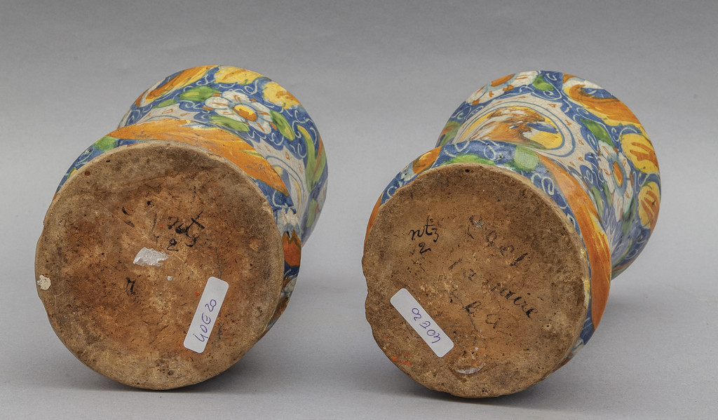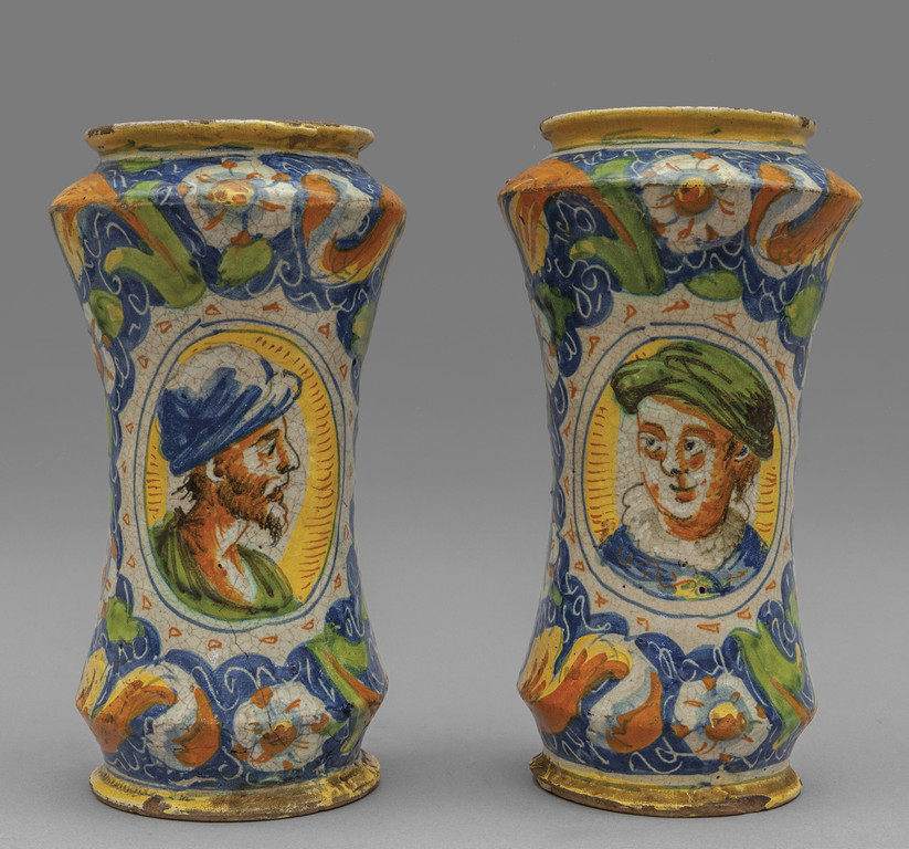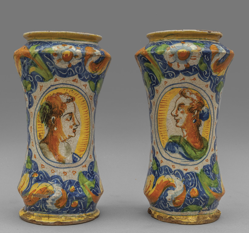Coppia di albarelli in ceramica decorazione in policromia con doppio medaglione con figure di personaggi Venezia sec.XVI