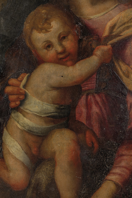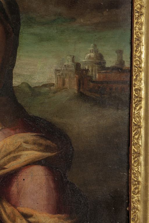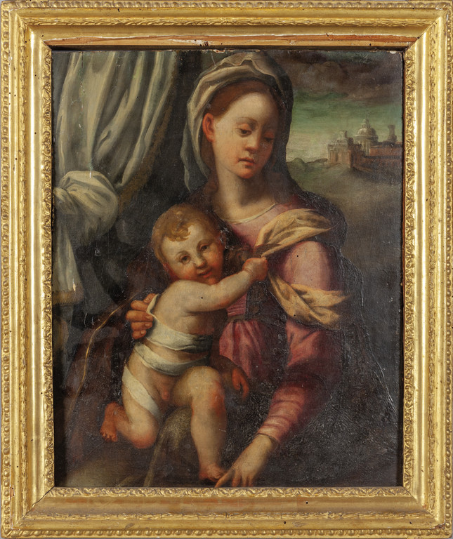 Scuola senese sec.XVI 'Madonna con Bambino con veduta del Duomo di Siena sullo sfondo' olio su tavola