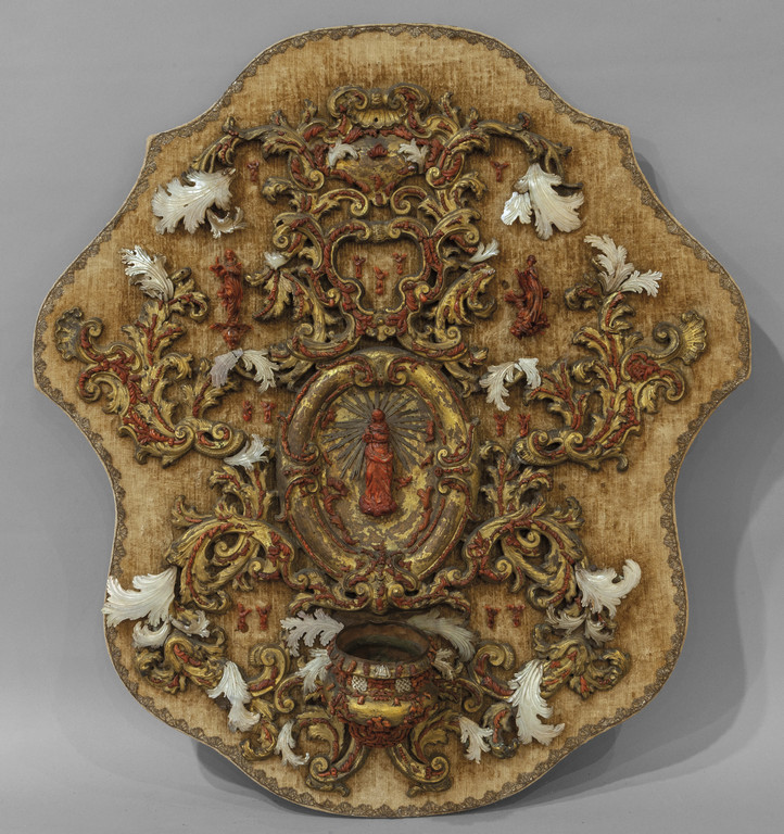 Acquasantiera in rame dorato madreperla e corallo al centro poggiante su una raggera la figura dell'Immacolata Trapani fine sec.XVII