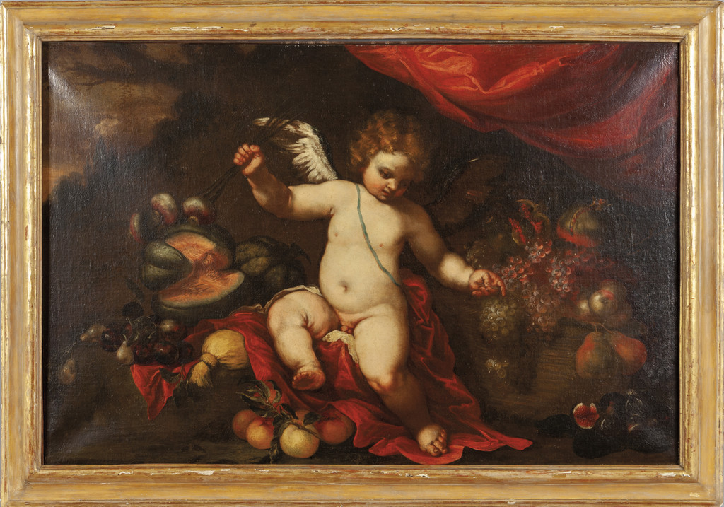 Scuola italiana sec.XVII 'Allegoria dell'autunno' olio cornice coeva a sagoma romana in legno dorato