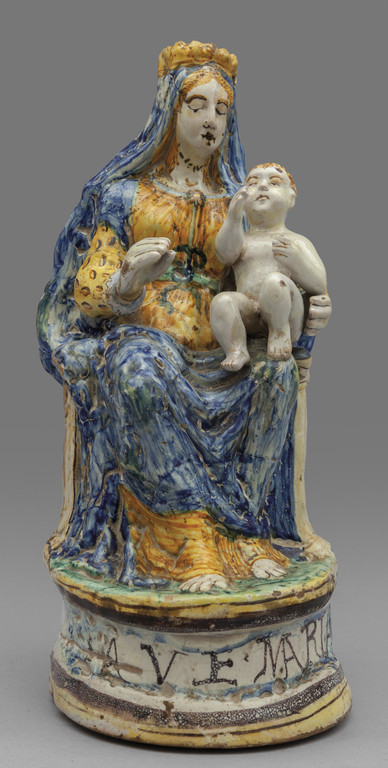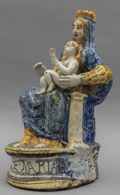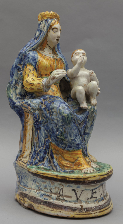 Madonna con Bambino in trono scultura in ceramica decorata in policromia con scritta 'Ave Maria' nella base Deruta sec.XVII