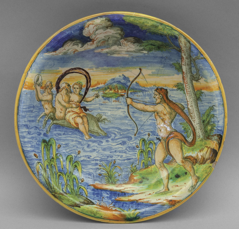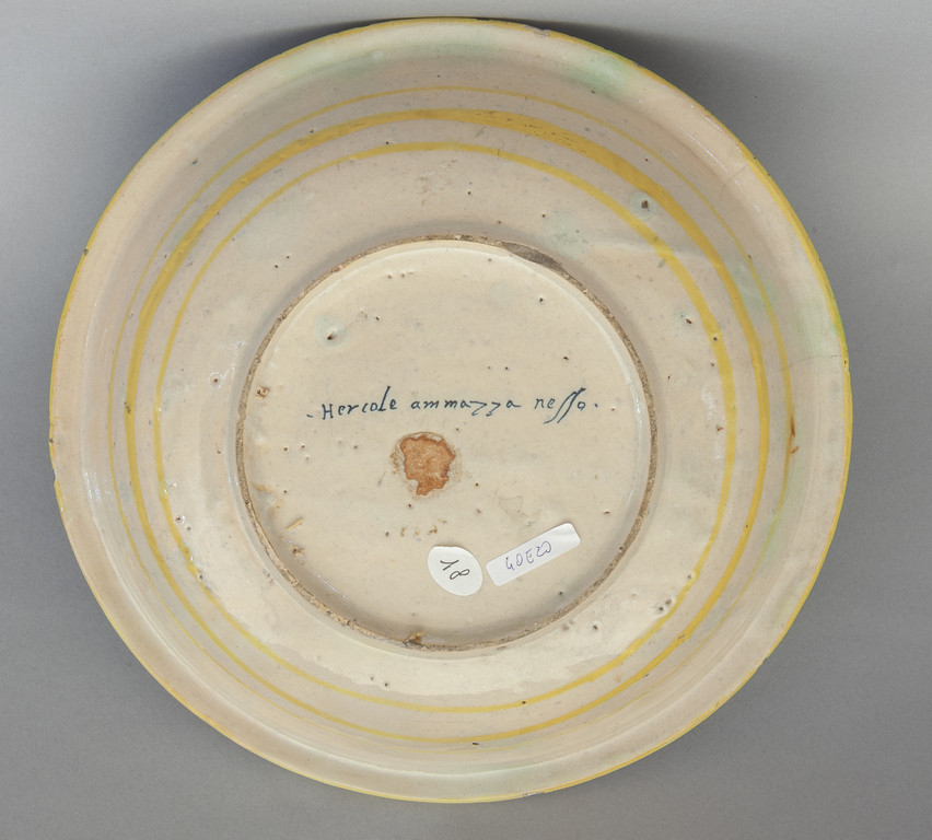 Coppa istoriata in ceramica decorata in policromia nel retro scritta 'Ercole ammazza Nesso' Urbino sec.XVI