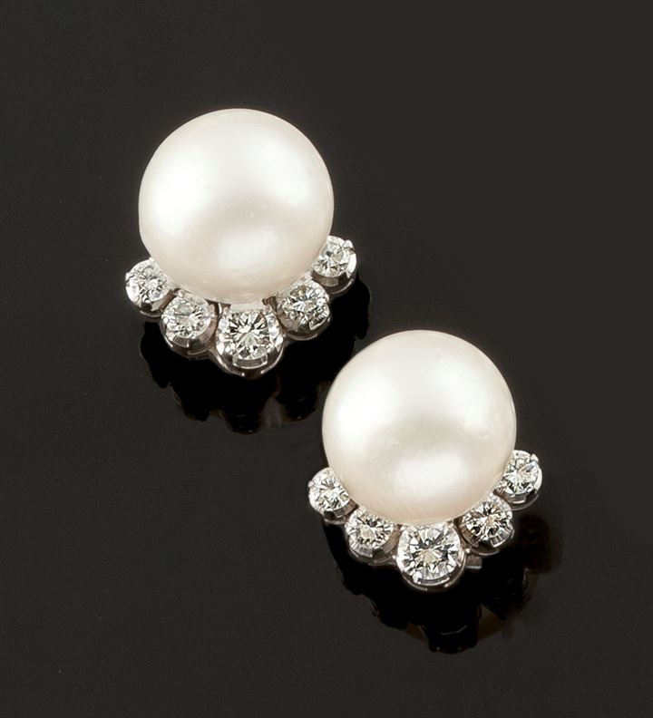 Coppia di orecchini in oro bianco, a clips, con due perle australiane del diam di mm 12,80 ca