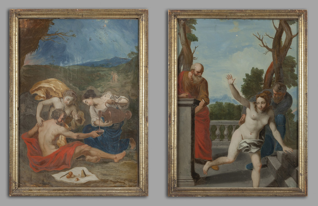 Scuola veneta sec.XVII 'Susanna e i Vecchioni' e 'Lot e le figlie' coppia di olii su vetro