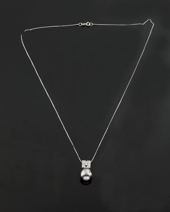 Catena con ciondolo in oro bianco con perla Tahiti del diam di mm 11,7 sormontata da elemento geometrico in diamanti taglio brillante per