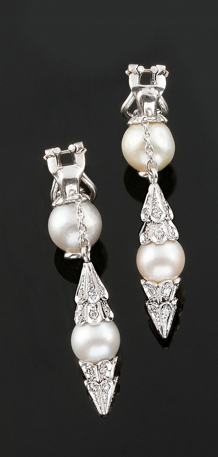 Coppia di orecchini pendenti in oro bianco, a clips, con quattro perle giapponesi dal diam di mm 8,1 a 9,2; diamanti taglio brillante e 8/8 per complessivi ct 0,50 ca
