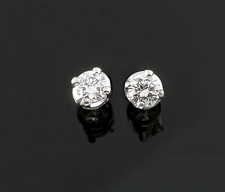 Coppia di orecchini in oro bianco, a lobo, con due diamanti taglio brillante per complessivi ct 0,60 ca