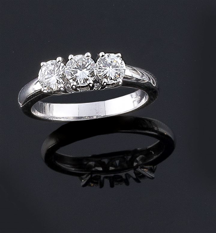 Anello in oro bianco, modello trilogy, con tre diamanti taglio brillante per complessivi ct 1,05 ca
