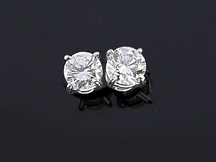 Coppia di orecchini in oro bianco, a lobo, con due diamanti taglio brillante per complessivi ct 0,72
