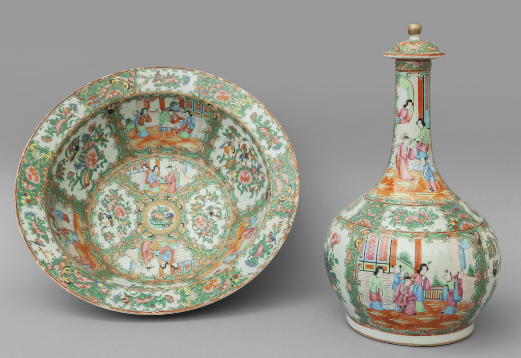 Bottiglia e coppa in porcellana Canton sec.XIX