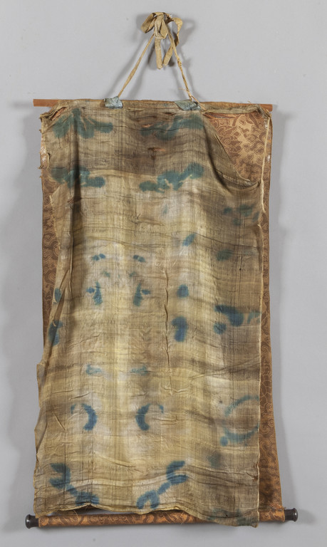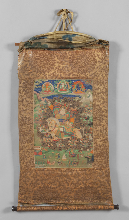 Antico tanka raffigurante generale a cavallo sormotato da tre divinità inizi sec.XIX