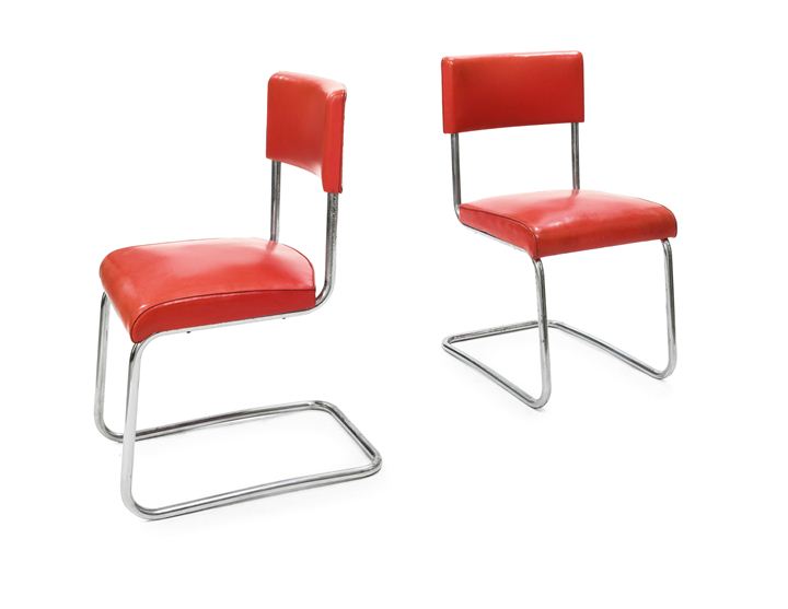 Due sedie razionaliste in tubo di metallo cromato con rivestimento in similpelle originale.