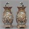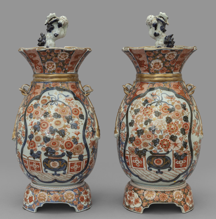 Coppia di vasi Imari in porcellana policroma a fiori su fondo bianco prese laterali a nastro coperchio a forma di cane di Pho Cina fine sec.XIX
