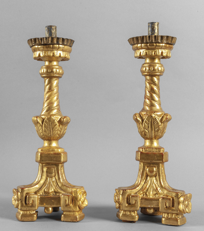 Coppia di candelieri Luigi XVI in legno intagliato e dorato sec.XVIII