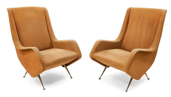 Due poltrone con rivestimento originale in panno di lana, gambe in fusione di ottone.
