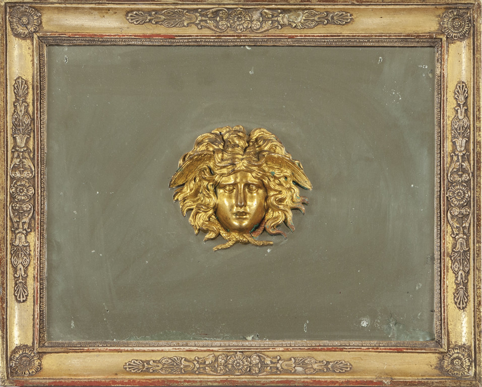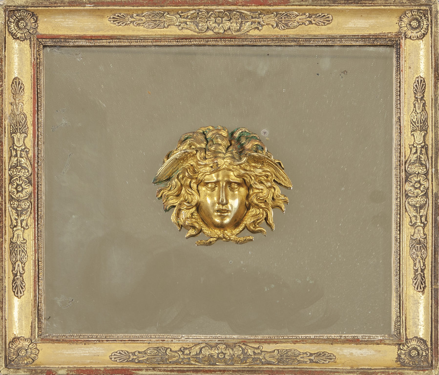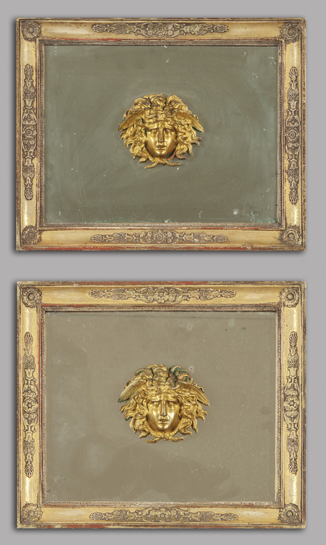 Coppia di cornici Carlo X contenenti antico bronzo raffigurante Apollo montato su specchio sec.XIX