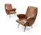 Due poltrone con rivestimento in similpelle marrrone, gambe in metallo con terminali in ottone.