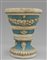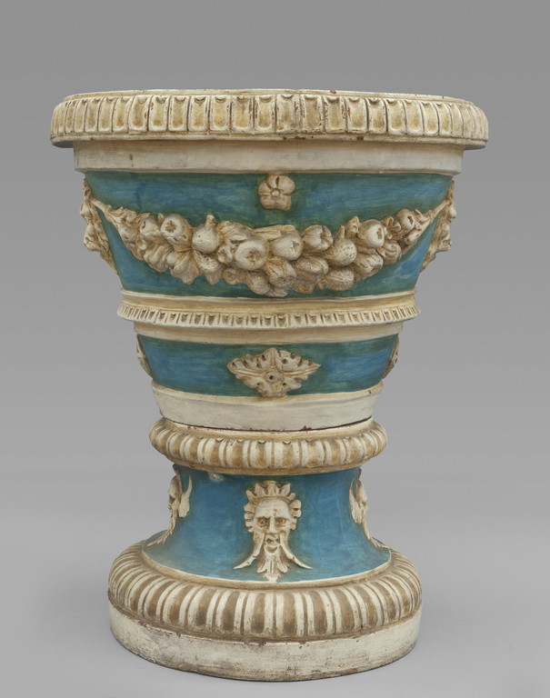 Cachepot in terracotta con base decorato con mascheroni e festoni nei toni del turchese e del beige