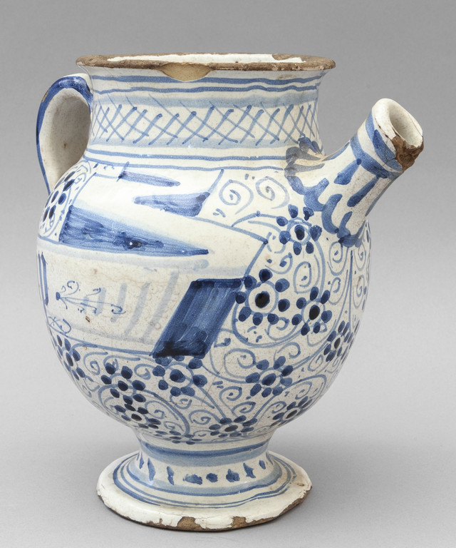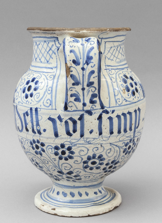 Versatoio in ceramica decorazione blu su fondo bianco con scritta medicinale Italia Centrale sec.XVII