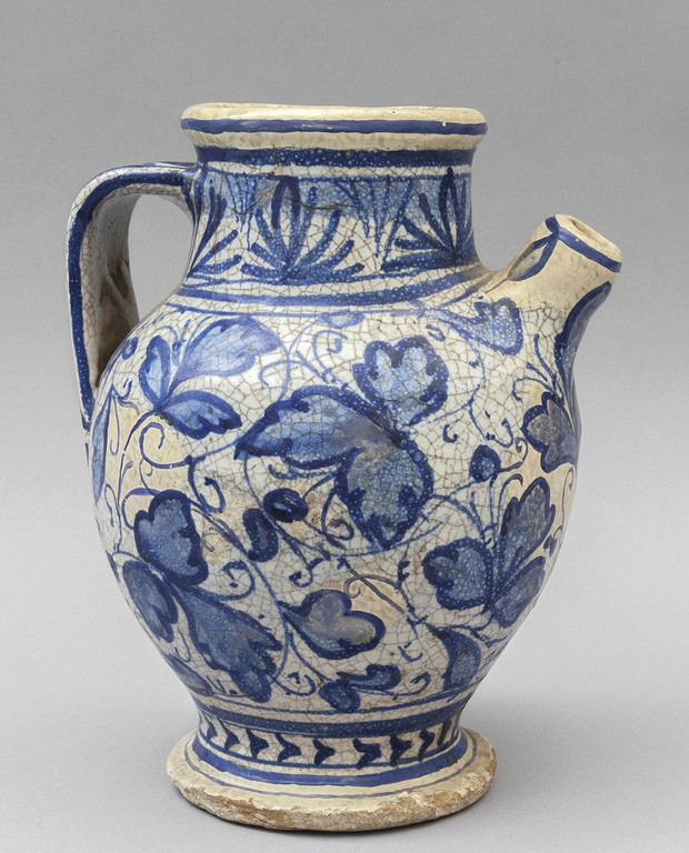 Versatoio in ceramica decorato con foglie blu su fondo bianco Italia Centrale sec.XVII