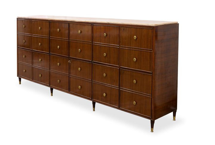 Grande mobile con fronte spartito a ventiquattro pannelli. Sei vani a sportelli in legno di palissandro.