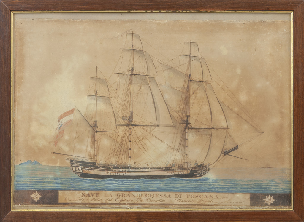 'Nave La Gran Duchessa di Toscana comandata e diretta dal Capitano G.Costantini e F.Landi' disegno acquarellato inizi sec.XIX
