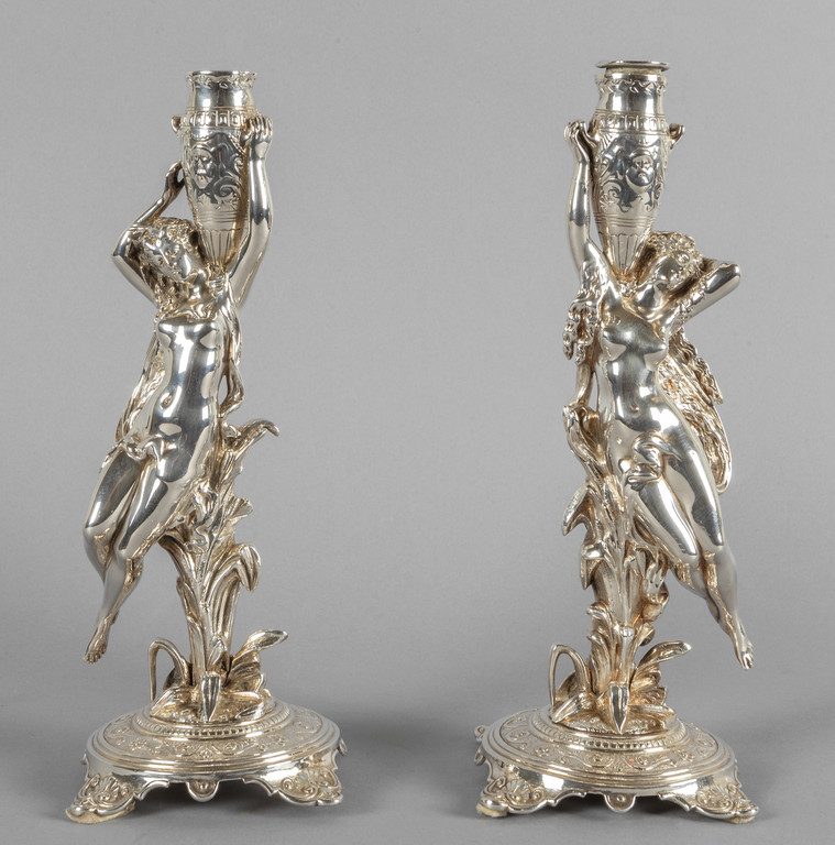 Coppia di candelieri in metallo argentato raffiguranti figure femminili che sorreggono un vaso