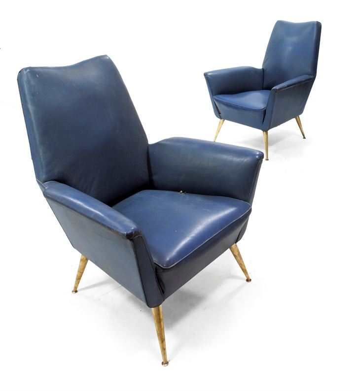 Coppia di poltrone con struttura in legno e rivestimento in similpelle. Piedi conici in ottone.