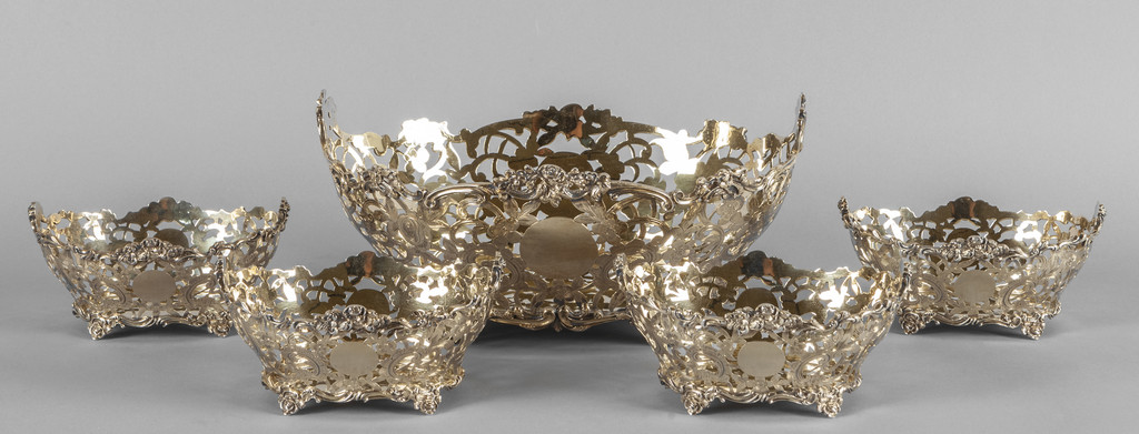 Centrotavola in argento con interno in vermeille composto da cinque cestini finemente sbalzati e traforati argentiere CSH Londra 1901