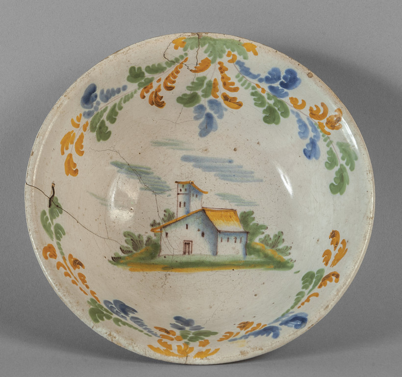 Coppetta in ceramica decorata in policromia su fondo bianco con casetta centrale Pavia sec.XVIII
