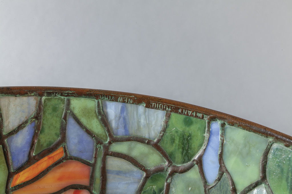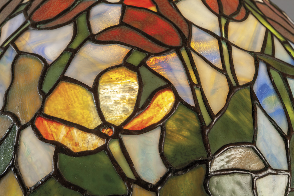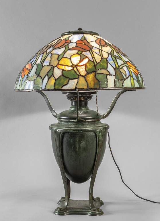 Lampada da lettura (ca.1899-1905) design a tulipano con cappello in vetri colorati Tiffany Studios NewYork City 1902-1932 marcata nella base e nel cappello Tiffany Studio NewYork 1453