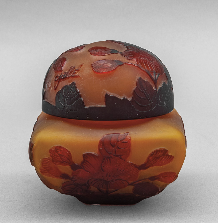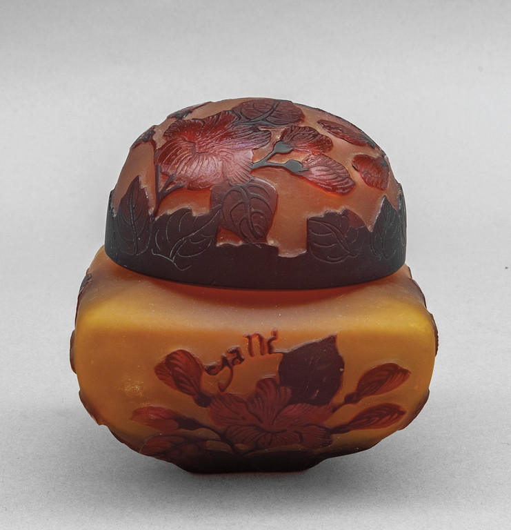 Scatola in vetro lavorato all'acido nei toni dell'arancio f.to Gallè