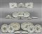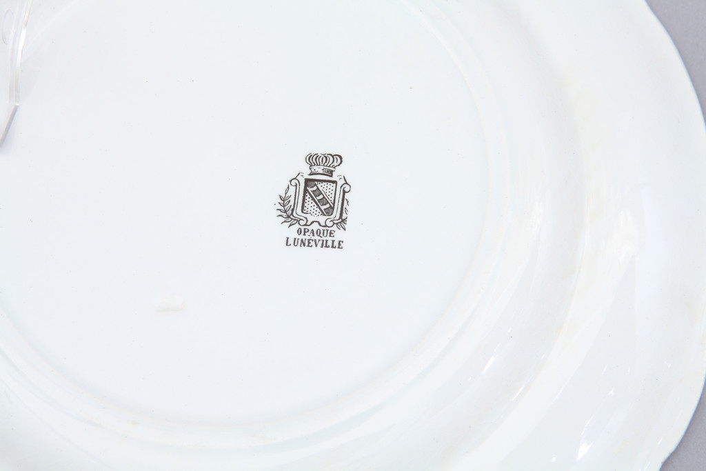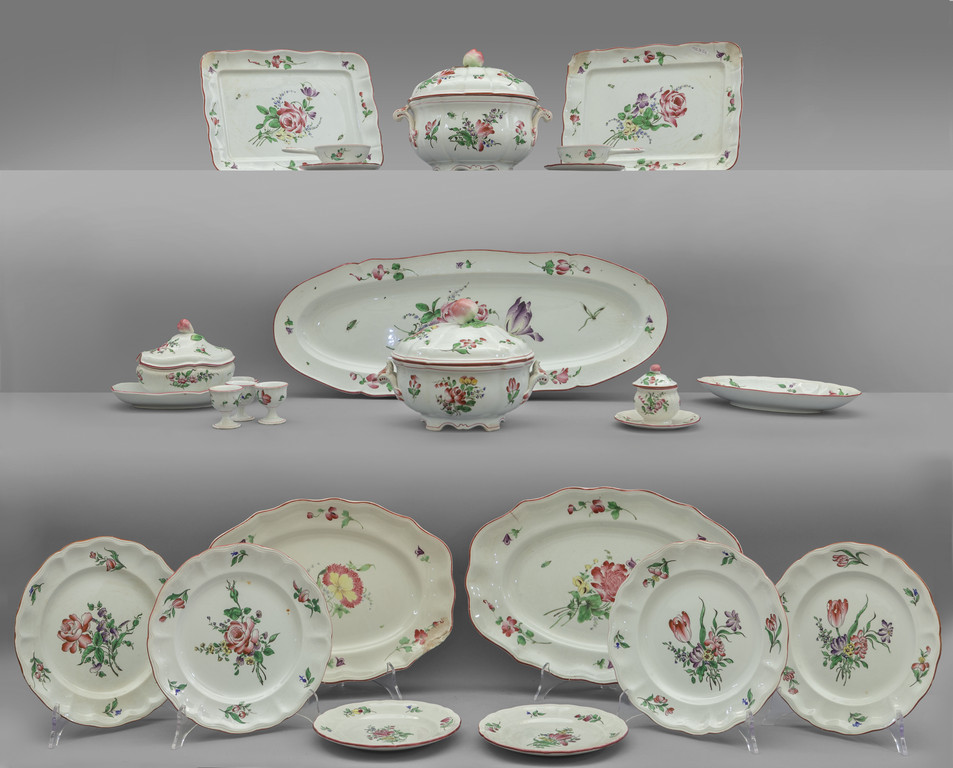 Servizio di piatti in porcellana Luneville (rose) bianca decorata con fiori in policromia composto da 36 piatti piani 18 fondi 12 frutta 9 tazze da consommè con 11 piattini 3 portauovo 2 zuppiere 1 salsiera 1 mostardiera 1 raviera 2 piatti da portata ovali 1 pesciera e coppia di vassoi rettangolari (sbeccature e felures)
