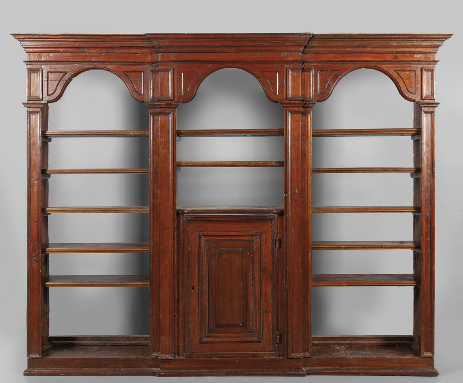 Libreria in noce a tre scaffalature quella centrale con sportello inferiore sec.XVIII