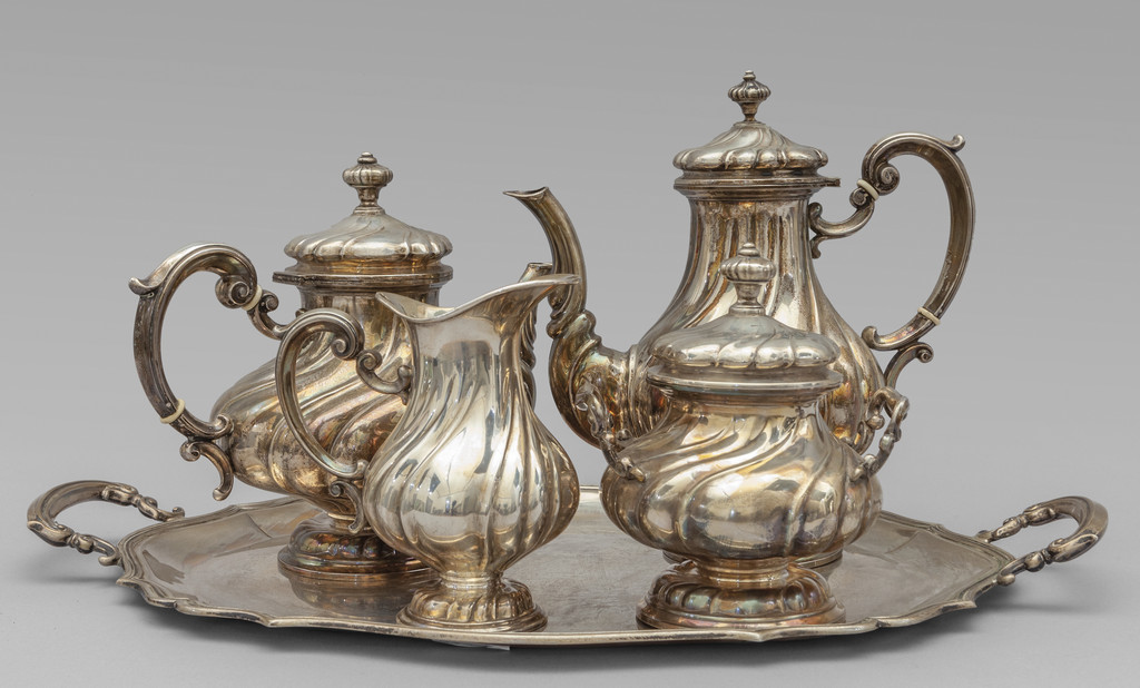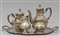 Servizio in argento composto da theiera cioccolatiera lattiera zuccheriera e vassoio con manici in stile barocco