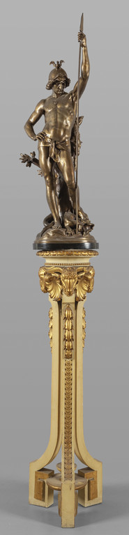 Guerriero statua in metallo f.ta Picaut con base in legno intagliato e dorato con terminali a forma di teste di ariete