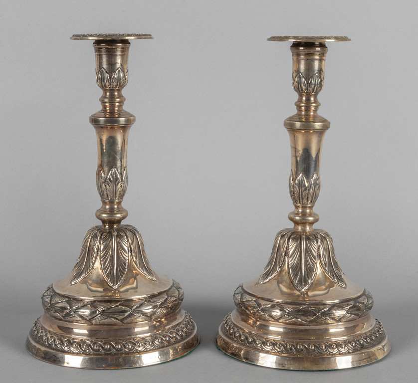 Coppia di candelieri in stile Luigi XVI in argento sbalzato Genova sec.XX