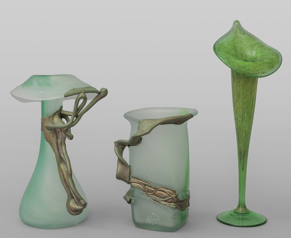 Tre vasetti in vetro di cui due lavorati all'acido con decorazioni in metallo
