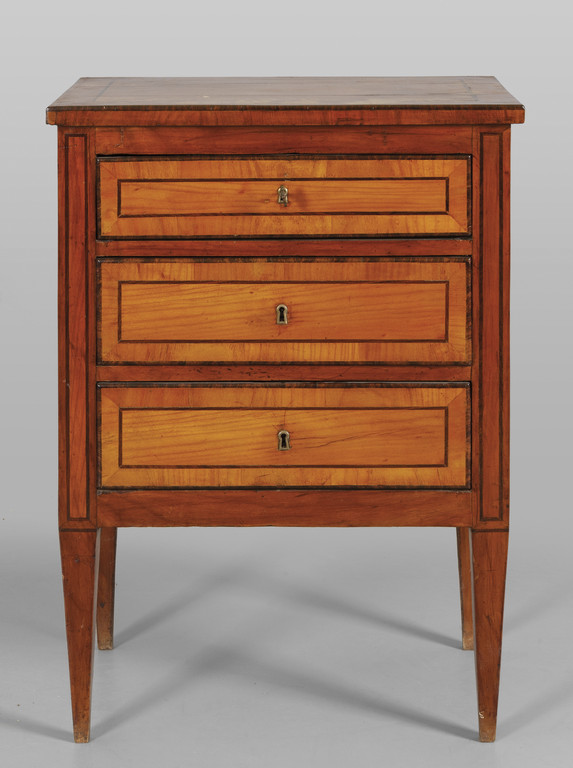 Piccolo comò Direttorio a tre cassetti lastronato in ciliegio e filettato in acero Toscana sec.XIX