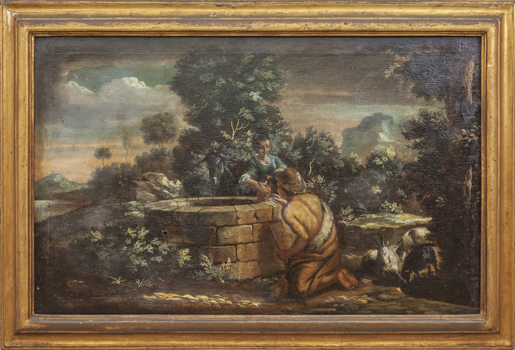 Scuola italiana sec.XVIII 'Paesaggio con pozzo e personaggi' olio
