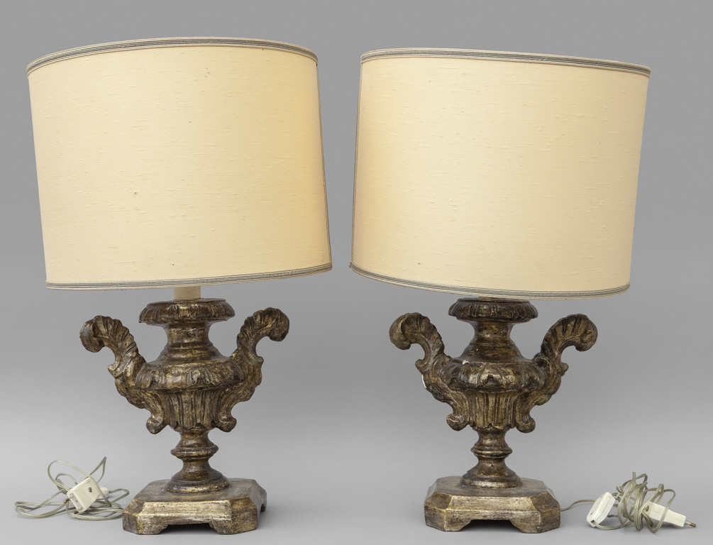 Coppia di vasetti Luigi XIV in legno intagliato e dorato a mecca adattati a lampade sec.XVIII