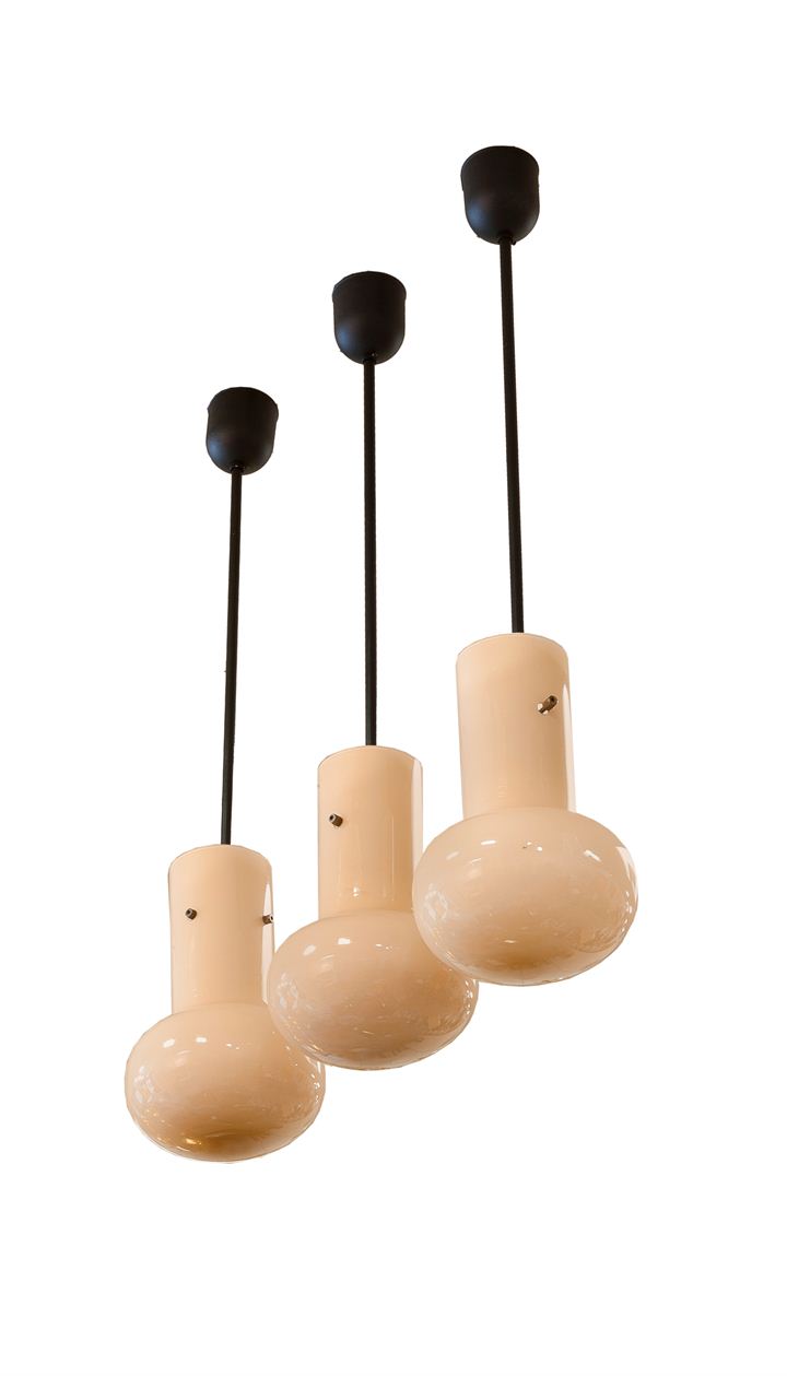 VENINI Tre lampade a sospensione con diffusore in vetro opalino. Montatura...