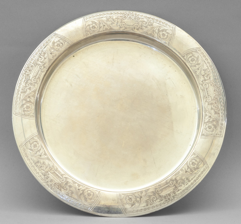 Un grande piatto Liberty in argento finemente cesellato di forma rotonda