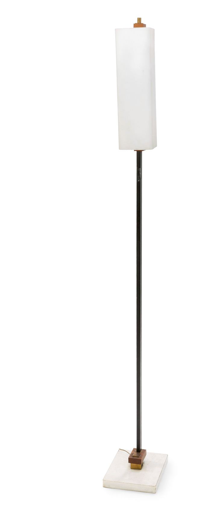 Stelo in metallo laccato nero e particolari in legno di teak e ottone, base in marmo bianco.