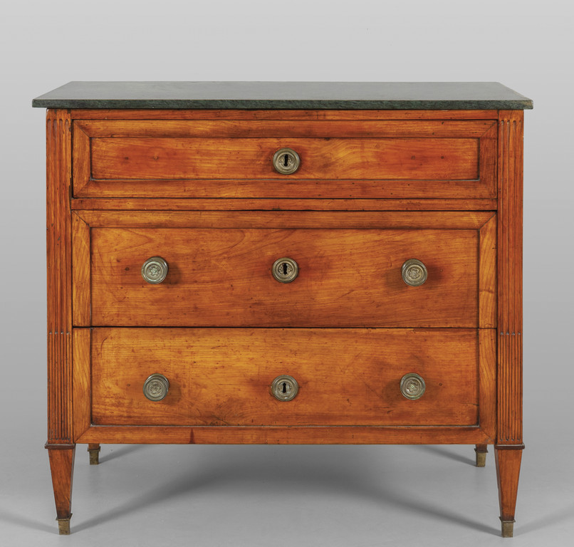 Comò Luigi XVI in massello di noce due cassetti più uno sul fronte montanti scolpiti piano in marmo sec.XVIII