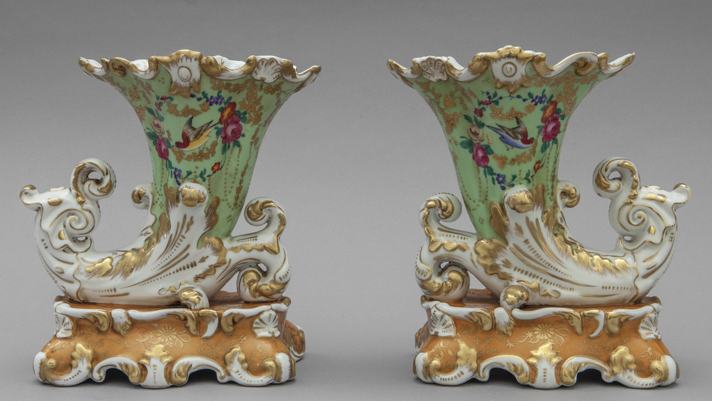 Coppia di vasi in porcellana policroma decorati con fiori e uccellini