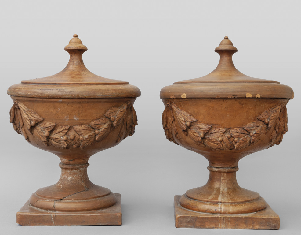 Coppia di vasi in terracotta con coperchio decorati con festoni